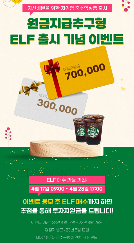 메리츠자산운용은 ELF 런칭을 기념하여 투자지원금과 커피쿠폰을 지급하는 이벤트를 진행중이다. 4월21일까지 이벤트에 응모하고 ELF펀드를 매수할 경우 1명을 추첨하여 투자지원금 70만원, 4월22일부터 28일까지 응모후 매수시 1명에게 30만원을 지급한다. 또 응모 후 펀드매수를 완료한 고객 전원에게 스타벅스 커피쿠폰을 지급한다.