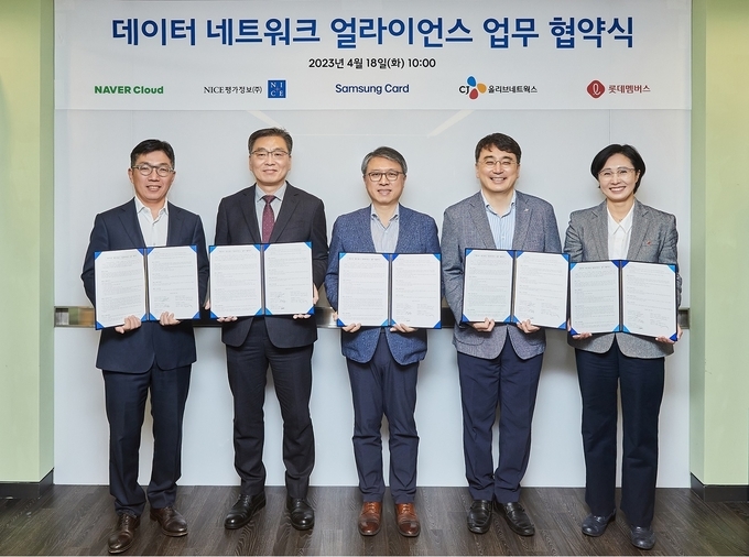 삼성카드는 지난 18일, 서울 중구 소재 삼성카드 본사에서 CJ올리브네트웍스, 네이버클라우드, NICE평가정보, 롯데멤버스와 함께 '데이터 얼라이언스' 업무제휴 협약(MOU)을 체결했다고 밝혔다.