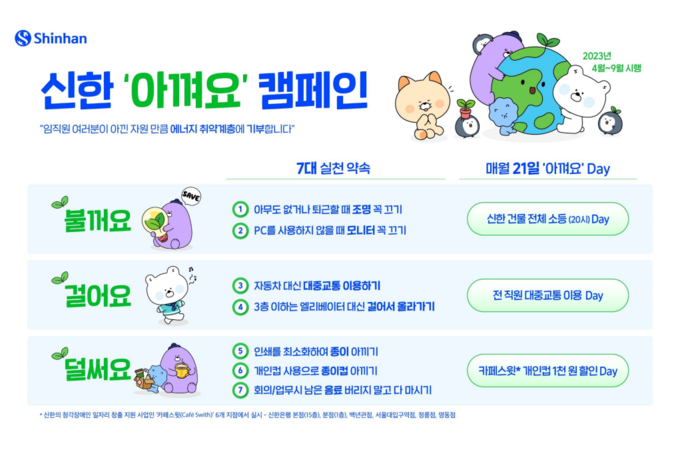 캠페인 기간 중 매월 21일을 '신한 아껴요 Day'로 지정해 ▲신한금융 전체 건물 소등 ▲전 직원 대중교통 이용 등의 이벤트를 진행한다. 또한 ▲신한금융이 청각장애인 일자리 창출을 위해 운영 중인 카페스윗에서는 개인컵 사용 시 1천원 할인 이벤트를 진행해 일반 고객도 에너지 절약에 동참할 수 있다.