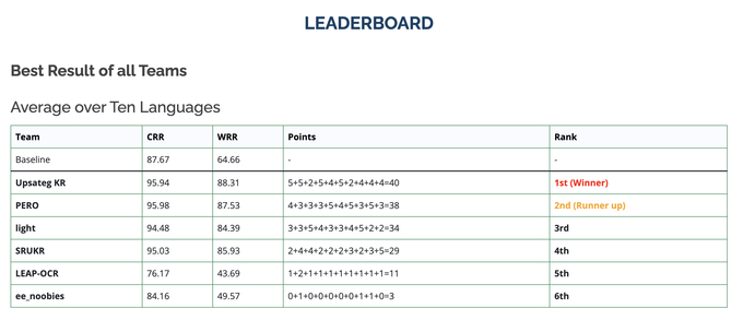 20일 업스테이지가 1위의 결과를 받은 IHTR 종목은 인도에서 쓰이는 대표 10종의 언어에 대한 글자 인식 문제를 다루었다. 업스테이지는 글자 인식 기술을 활용하여 대회에 참가해 이전에 경험이 없던 신규 언어 임에도 불구하고 최고 성능의 모델을 구축, 빛나는 성과를 보여주었다.