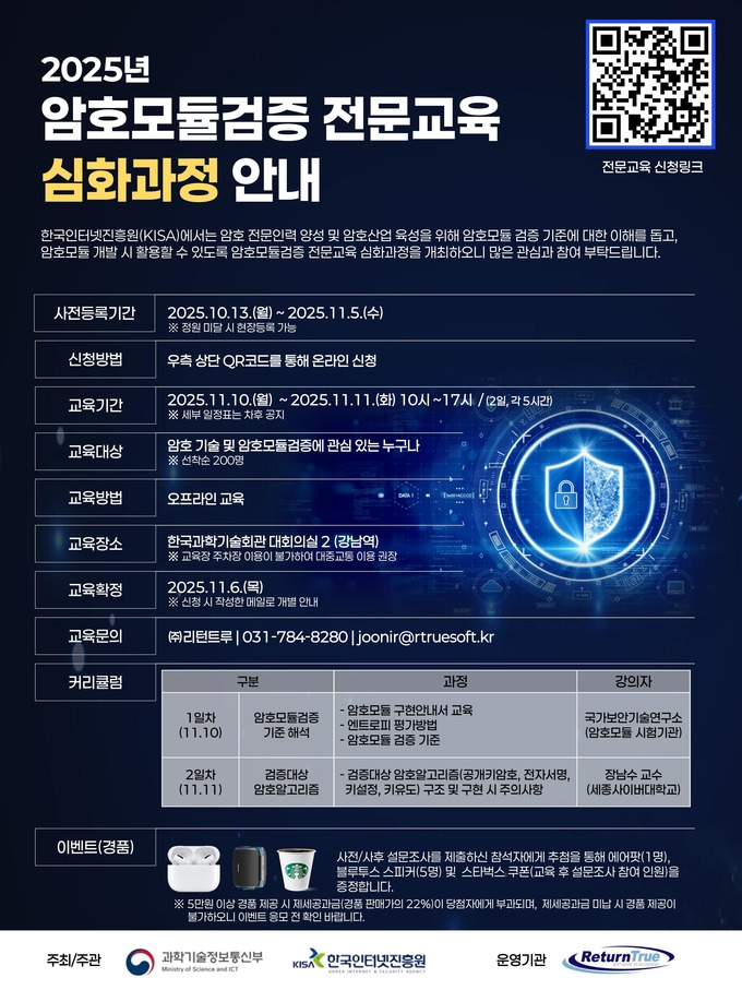 암호모듈검증 심화 과정은 암호모듈 개발 및 검증기준 해석 역량 강화를 위한 실무 중심의 과정으로 무료로 진행되며, 11월 10일(월) ~11일(화) 양일간 한국과학기술회관에서 열린다.